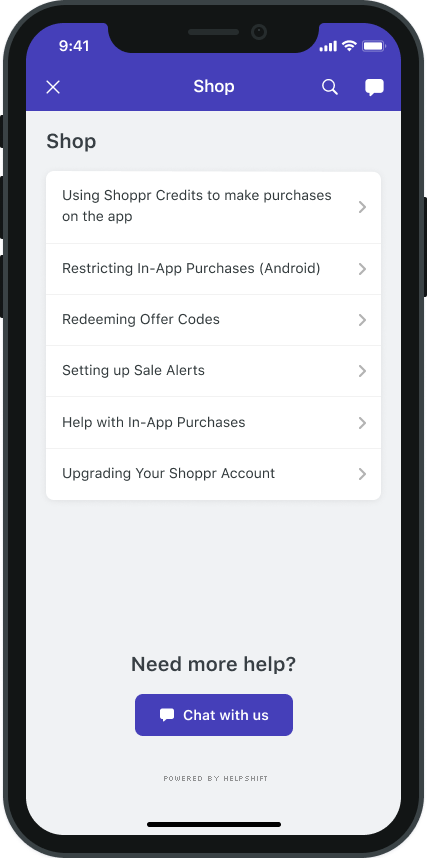 This View Controller combines the FAQ, Search and Contact Us functionality together in a single interface. In this view, a user can search for a specific question in the FAQ failing which they can report an issue. When you respond back to their question from the Helpshift Agent Dashboard, the reply will be shown as a count besides Contact Us, clicking on which will open up the conversation.